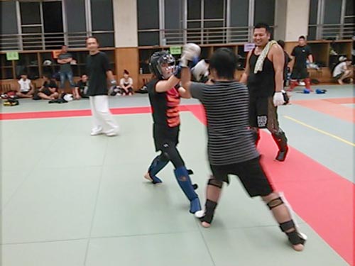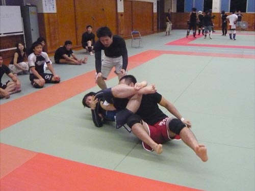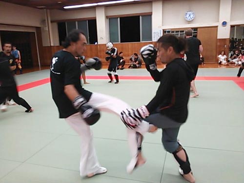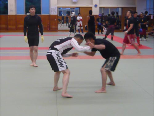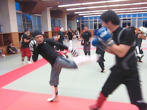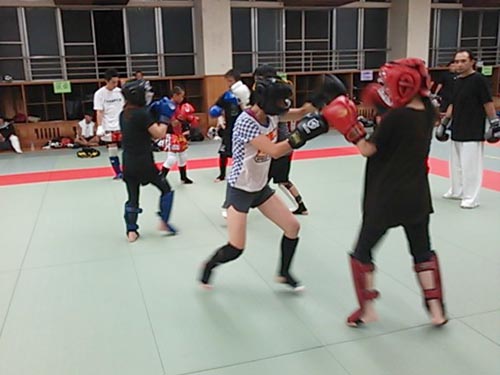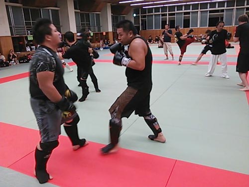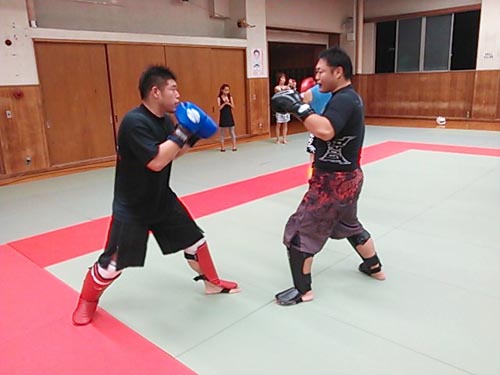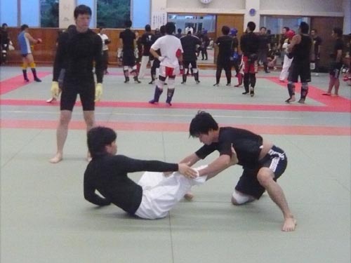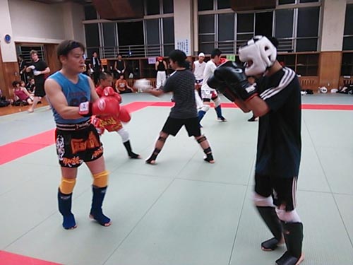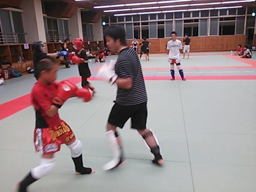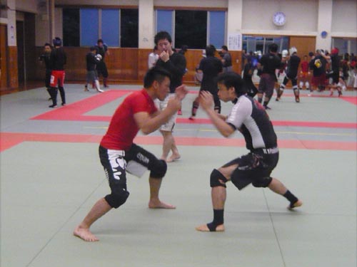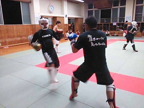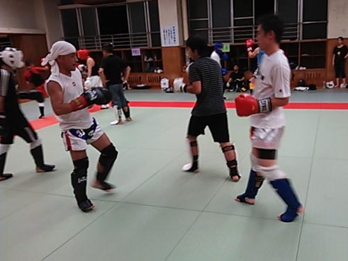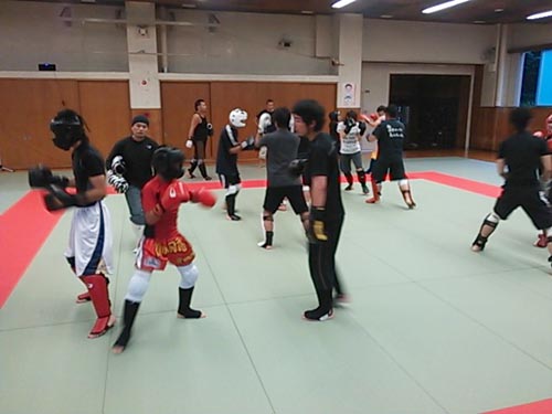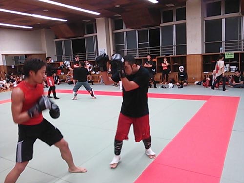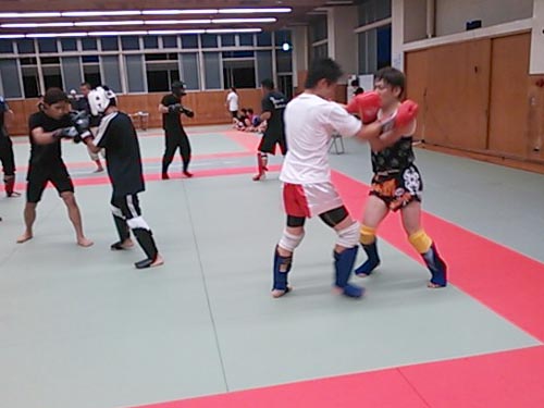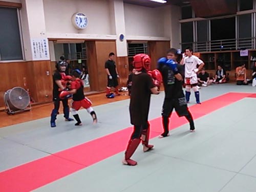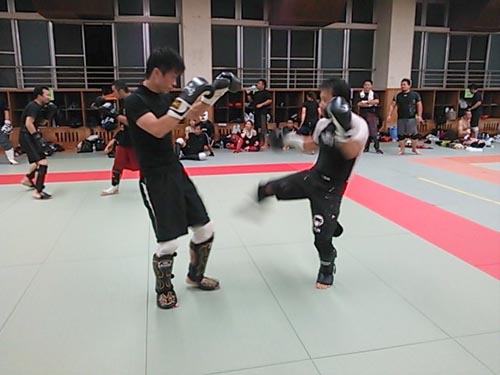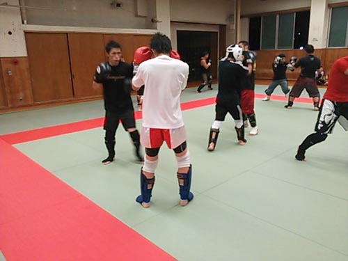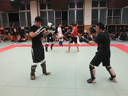 練習内容ですが、いつもどおり準備運動のあと、打撃組・寝技組に分かれ、寝技組は対人練習を、打撃組もミットを使った攻撃・防御の練習を行い、その後、みんなでスパーリングを回していきました。