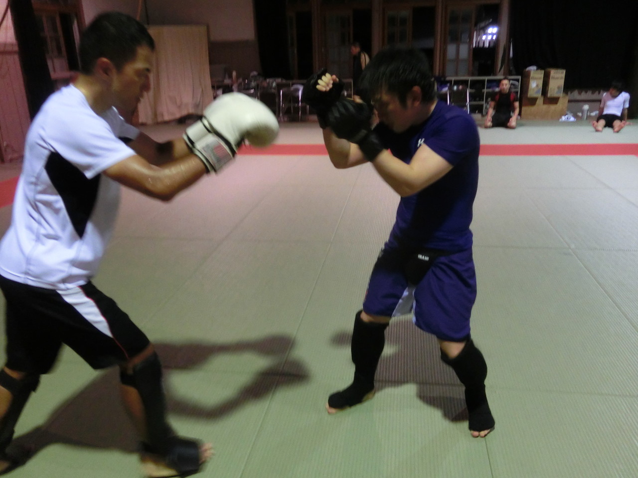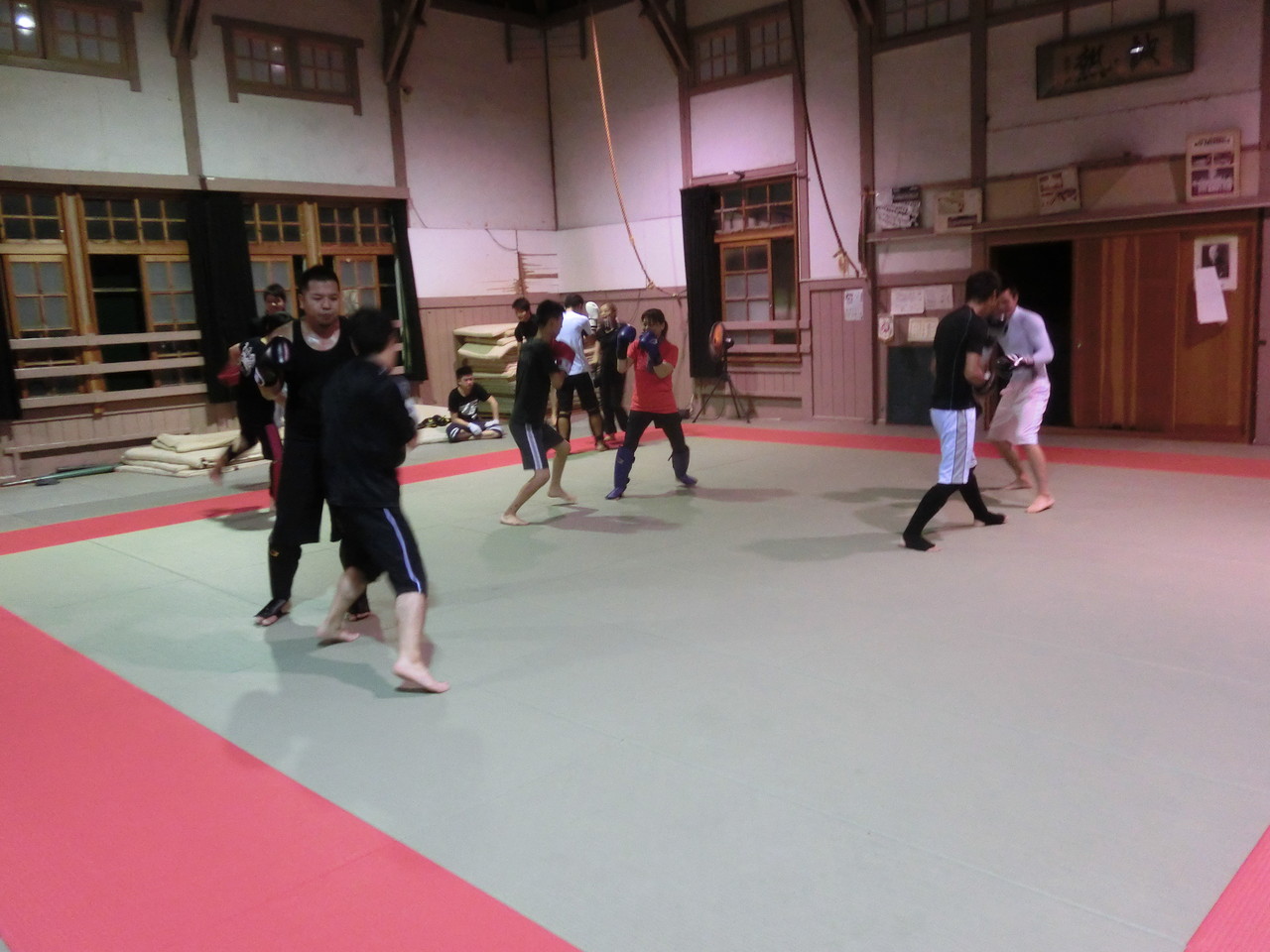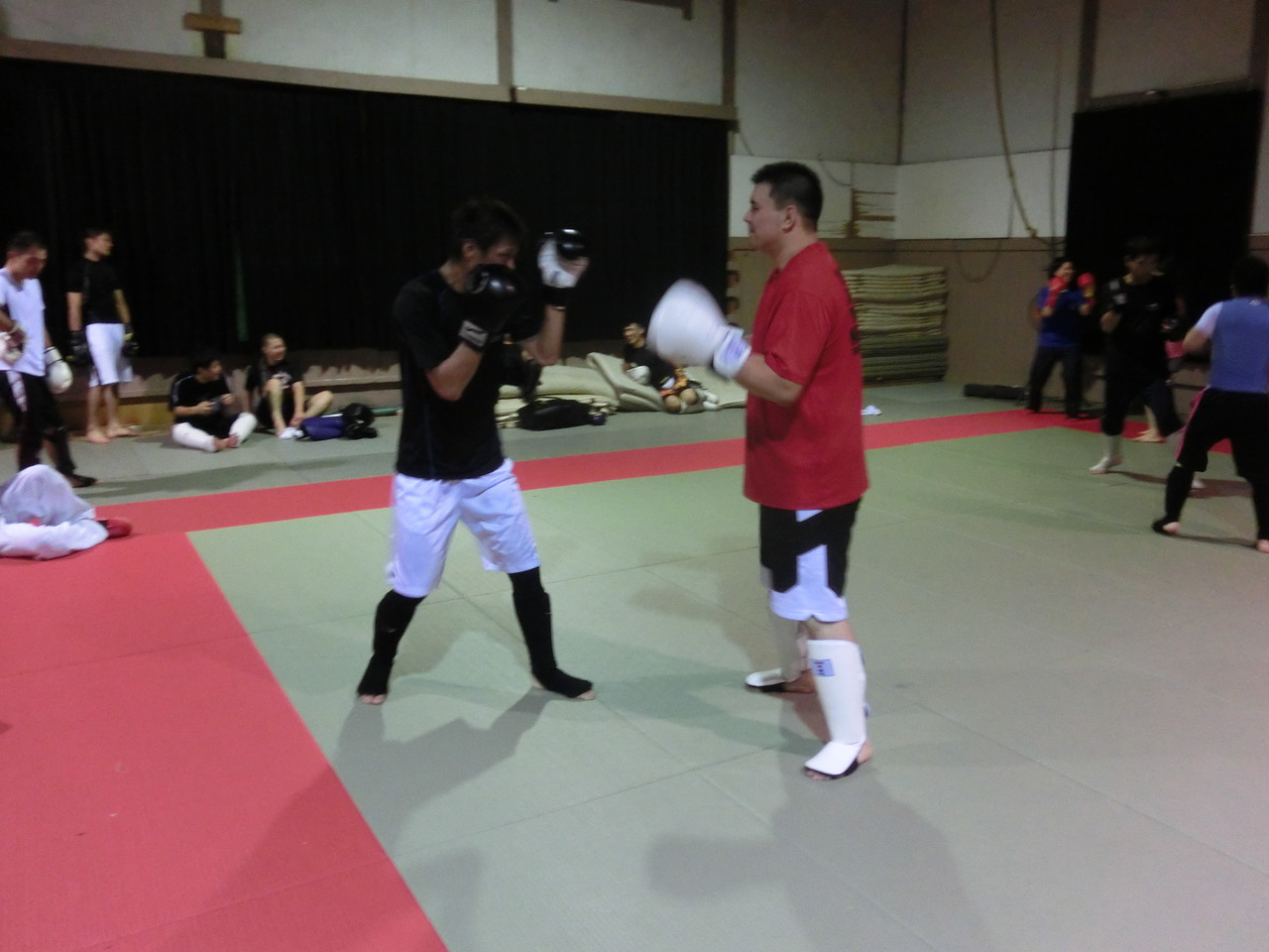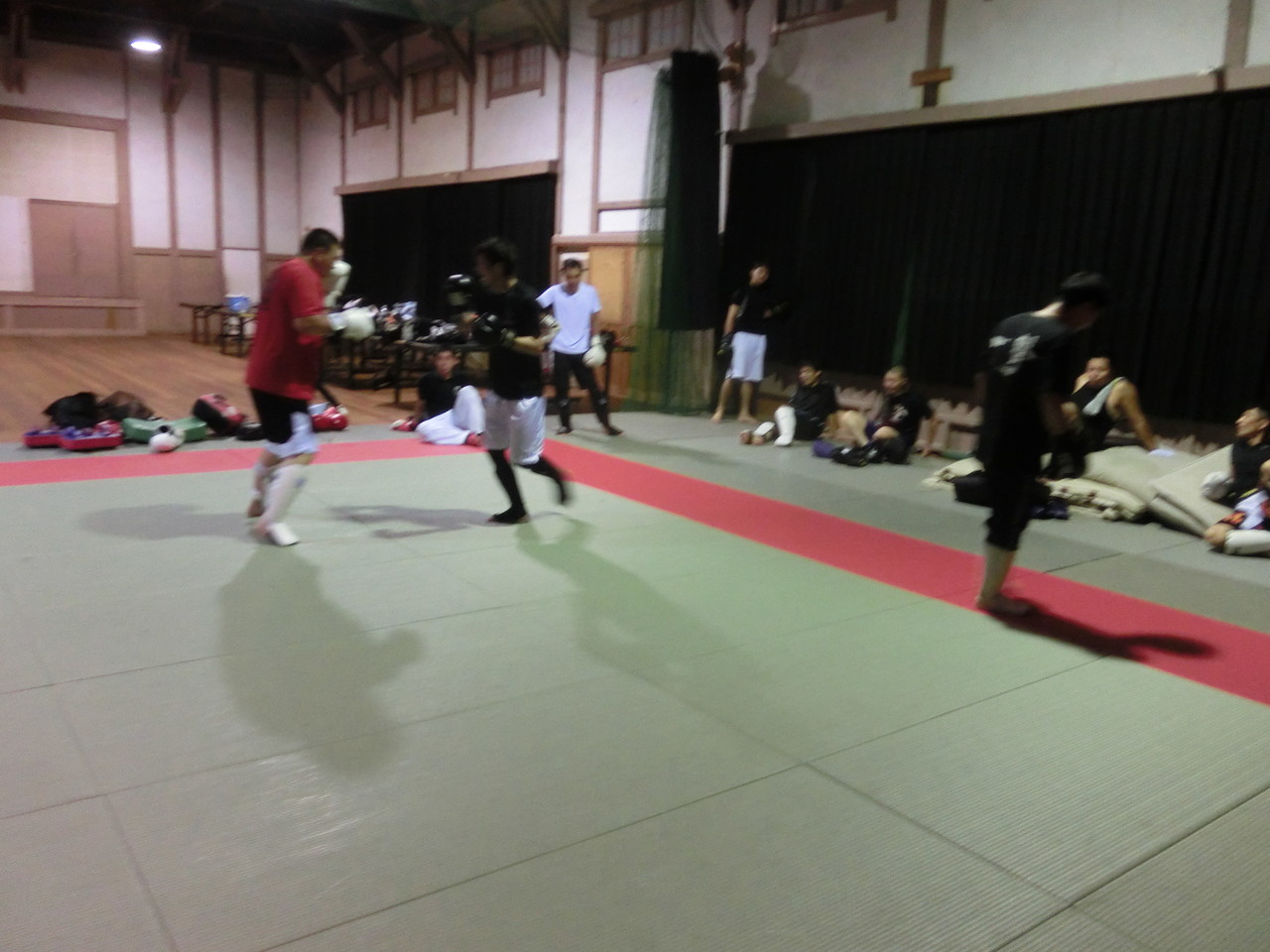 練習内容ですが、いつもどおり準備運動のあと、打撃組・寝技組に分かれ、寝技組は対人練習を、打撃組もミットを使った攻撃・防御の練習を行い、その後、みんなでスパーリングを回していきました。