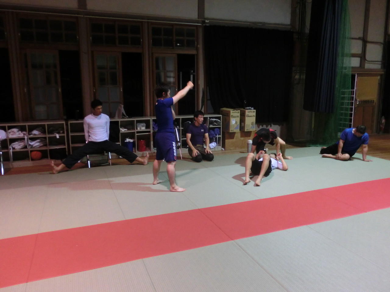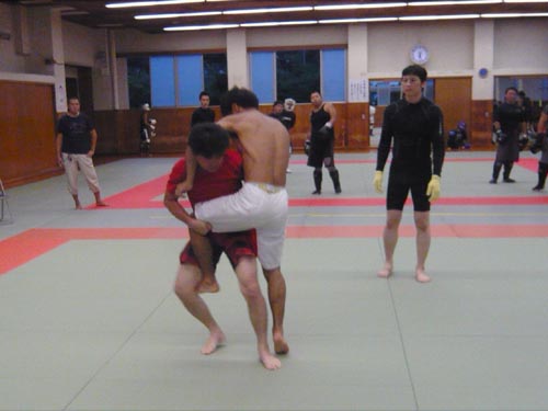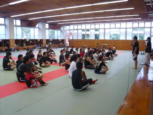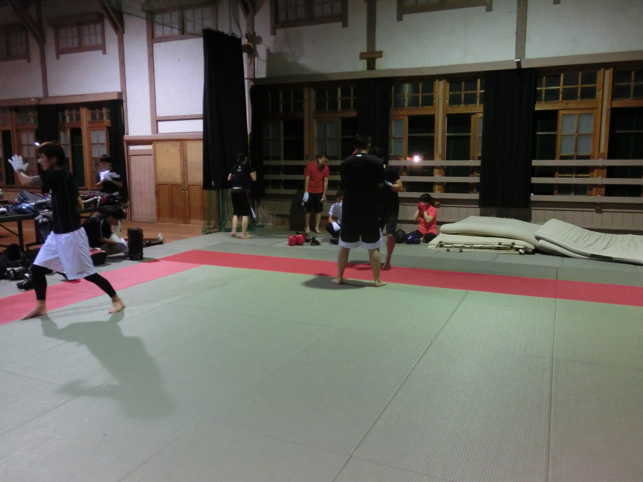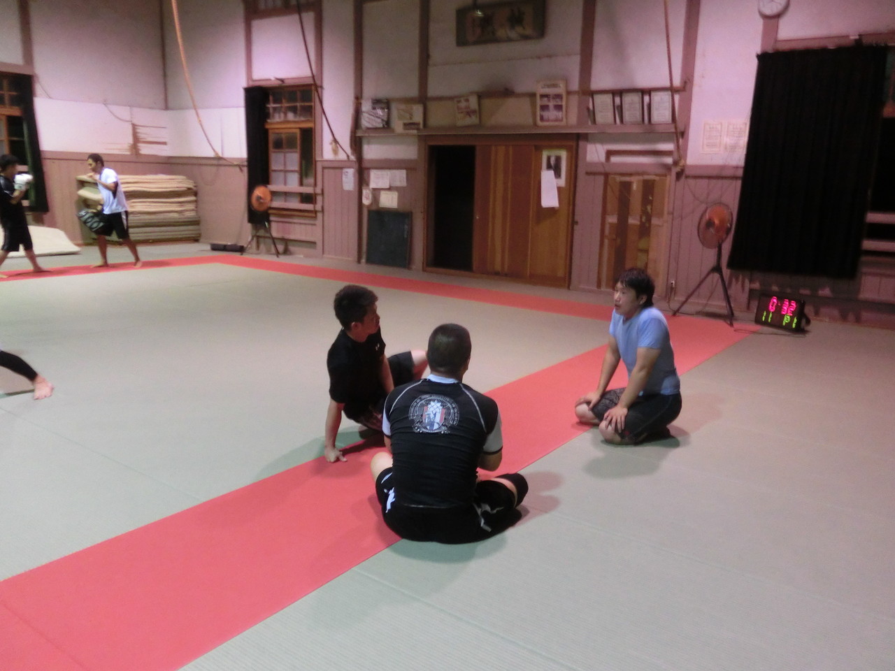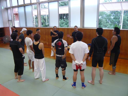 練習内容ですが、いつもどおり準備運動のあと、打撃組・寝技組に分かれ、寝技組は対人練習を、打撃組もミットを使った攻撃・防御の練習を行い、その後、みんなでスパーリングを回していきました。