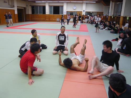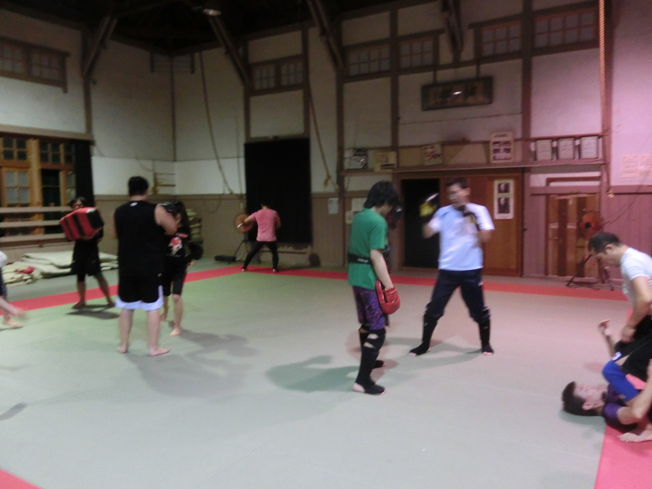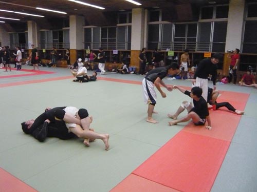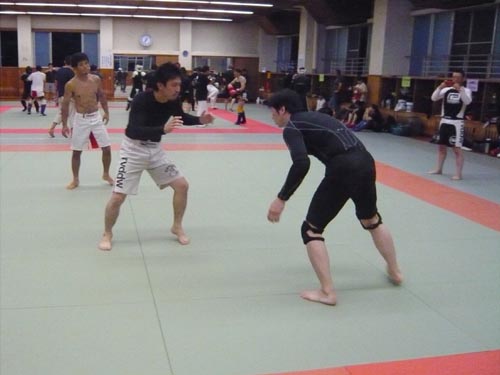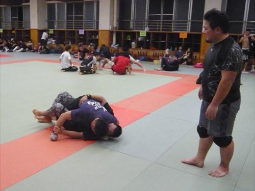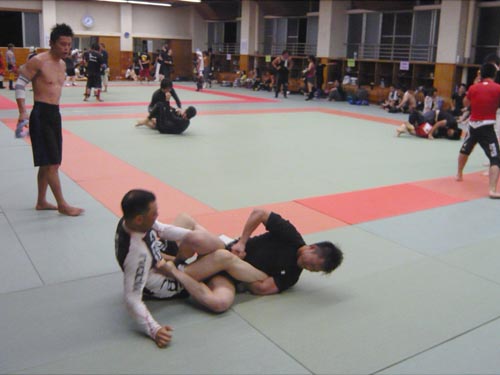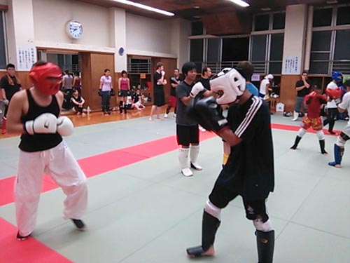 練習内容ですが、いつもどおり準備運動のあと、打撃組・寝技組に分かれ、寝技組は対人練習を、打撃組もミットを使った攻撃・防御の練習を行い、その後、みんなでスパーリングを回していきました。この日も多くの方に参加いただいたので、道場を目一杯使って、実践練習を行いました