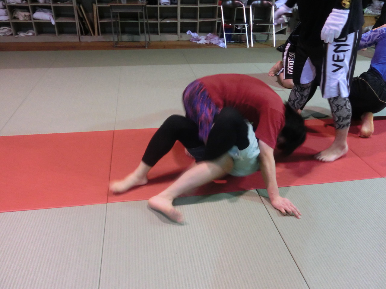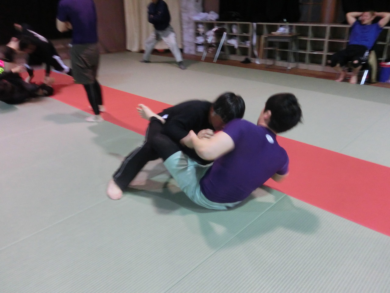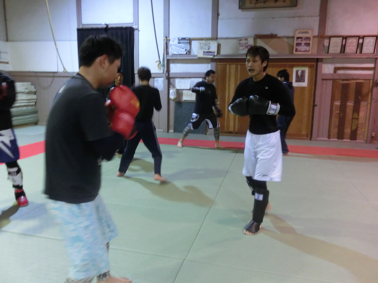 練習内容ですが、いつもどおり準備運動のあと、打撃組・寝技組に分かれ、寝技組は基礎練習を、打撃組もミットを使った攻撃・防御の練習を行い、その後、みんなでスパーリングを回していきました。
