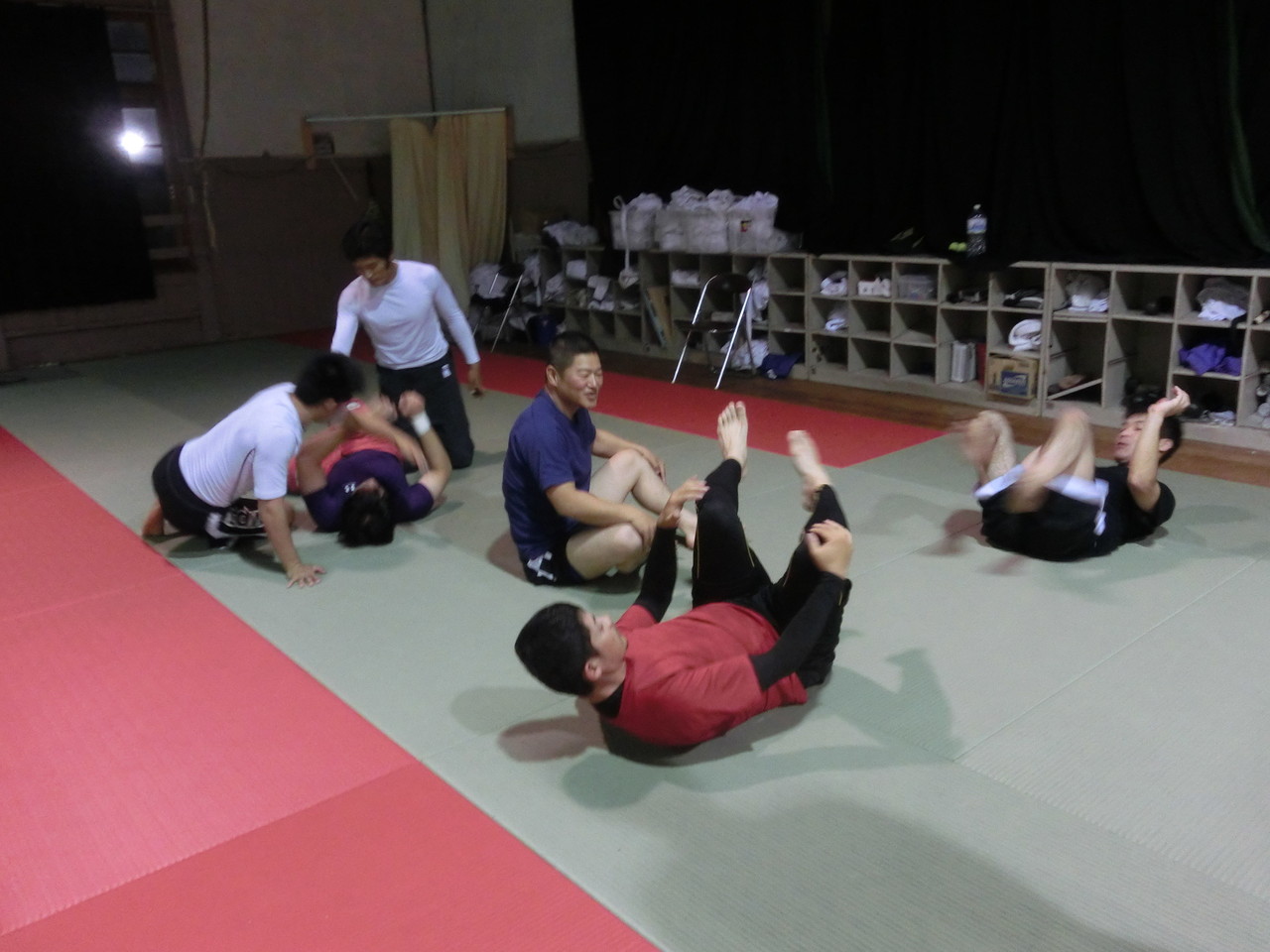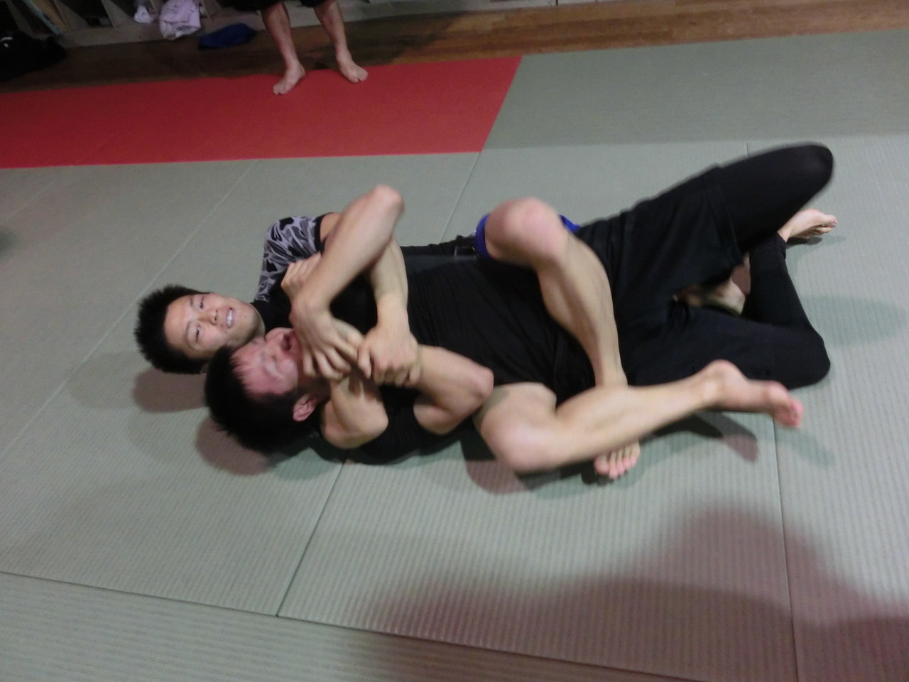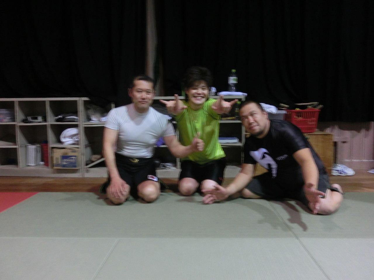 練習内容ですが、いつもどおり準備運動のあと、打撃組・寝技組に分かれ、寝技組は基礎練習を、打撃組もミットを使った攻撃・防御の練習を行い、その後、みんなでスパーリングを回していきました。![]()